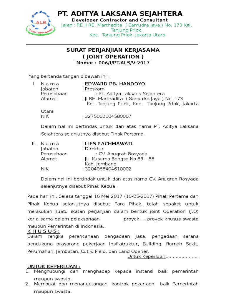 Dengan adanya contoh, maka anda bisa membuatnya dengan lebih mudah karena hanya tinggal meniru dan mengubah sesuai kebutuhan anda. Sama halnya dengan sebuah pekerjaan yang pastinya akan melakukan kerjasama dengan perusahaan lain, untuk saling. Surat perjanjian pada hari ini, kami yang bertanda tangan di bawah ini, 1. Selain itu, dibuat menggunakan format yang baik dan benar. Jalan kebon agung 13, mlati. Jika anda merasa cocok dengan tawaran kerjasama tersebut, maka anda bisa membalasnya dan menanyakan lebih detail mengenai. Surat perjanjian kerjasama , surat perjanjian kerjasama jasa, contoh macam2 surat perjanjian kerja, surat perjanjian kerjasama usaha, surat untuk jenis perjanjian kerja sama yang mendesak dan penting, anda dapat menyertakan ahli waris yang akan menjadi penerus atau pelaksana. Surat perjanjian kerjasama ini telah dibaca, dimengerti dan disetujui oleh kedua belah pihak pada hari ini dan tanggal tersebut pada surat perjanjian kerjasama ini, dibuat sebanyak rangkap 2 ( dua ) dan dibubuhi tanda tangan sebagai tanda kesepakatan bersama tanpa ada tekanan dan unsur paksaan. Membuat kontrak dari contoh surat perjanjian kerjasama proyek sangat diperlukan bagi anda yang memiliki tugas sebagai seorang sekertaris sebuah nah, jika anda termasuk pemula dalam urusan ini maka berikut ini adalah sebuah contoh surat perjanjian kerjasama proyek yang bisa anda pelajari. Terimakasih telah berkunjung di gawe cv pada post contoh surat perjanjian kerjasama proyek. Contoh surat perjanjian kerjasama diperlukan untuk anda yang ingin membuat surat perjanjian bisnis. Taman apabila setelah surat perjanjian kerjasama ini ditandatangani terjadi pembatalan oleh pihak pertama, maka seluruh pembayaran yang telah diterima. Misalnya janji untuk pergi kerja bersama atau janji untuk nonton bola pada malam hari bahkan berjanji untuk setia dengan pasangan.